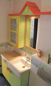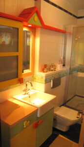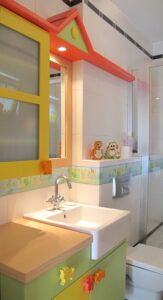 Ev temalı çocuk odası banyosu renkli ve fonksiyonel bir kullanım sağlar.